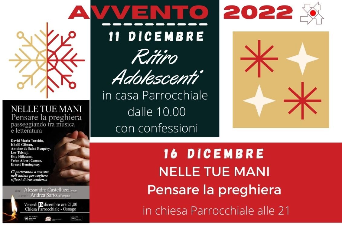 La parrocchia di Osnago organizza i seguenti momenti per la seconda metà dell’Avvento. Domenica 11 dicembre ritiro adolescenti con confessioni in casa parrocchiale dalle 10. Venerdì 16 dicembre alle 21 presso la chiesa parrocchiale serata di riflessione comunitaria Nelle tue mani, pensare la preghiera passeggiando tra musica e letteratura con Alessandro Castellucci, voce, e Andrea Sarto, all’organo. Sabato 17 dicembre serata pre – adolescenti e adolescenti (con iscrizione entro il 15 dicembre: https://forms.gle/c9uosaRMKp9f3XPH7): Santa Messa alle 18, cena al CPO (3 euro) alle 19.30, serata preadolescenti alle 20.30, serata adolescenti alle 22.