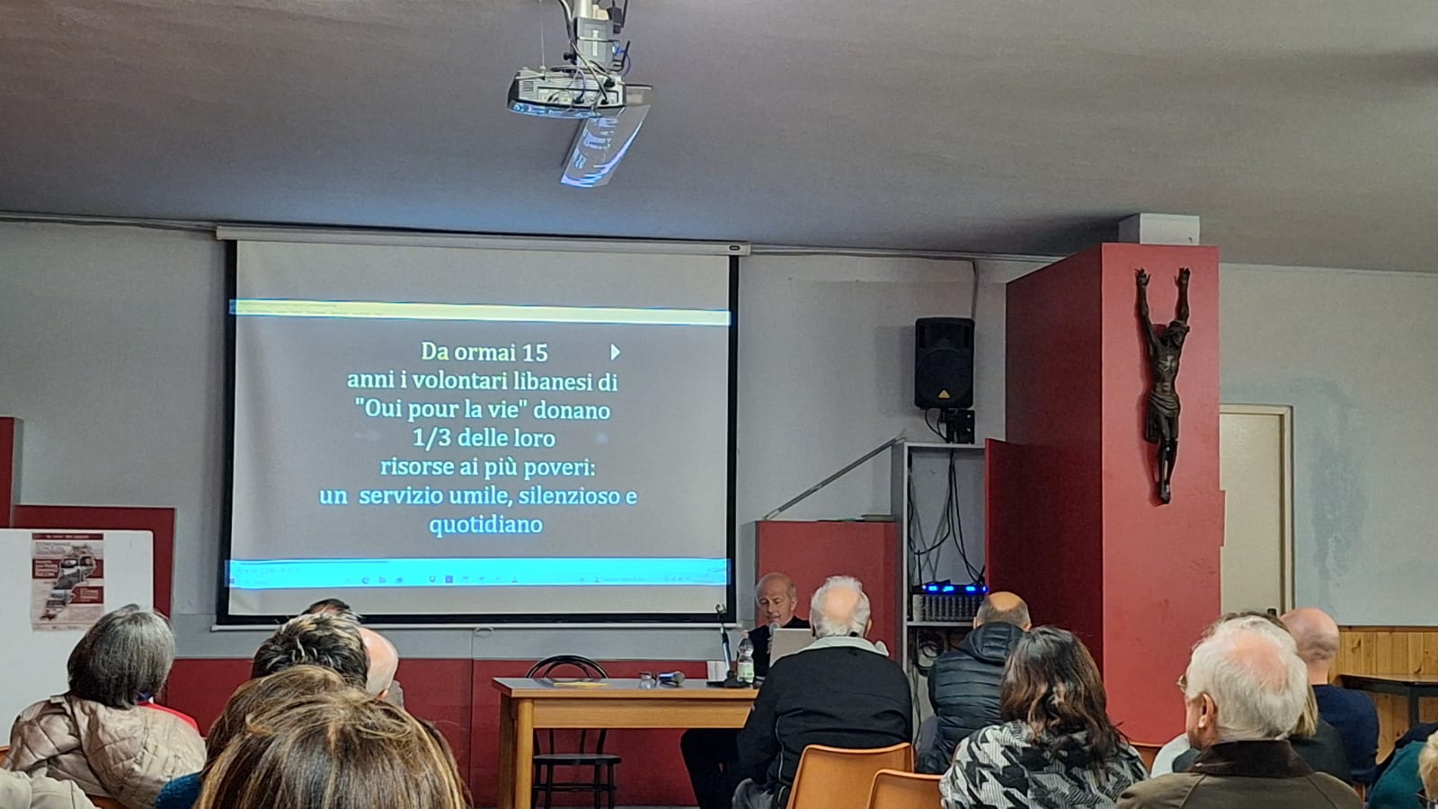 Padre Damiano ha poi raccontato l’operato dell’associazione Oui pour la vie, con sede nella città di Damour, a sud di Beirut, nata in questo contesto per lavorare insieme con mezzi di pace, stando vicini e portando aiuti ai bisognosi, senza distinzioni legate alle origini e al credo religioso. Inoltre le stesse persone aiutate dall’associazione a loro volta offrono il proprio aiuto, per quanto modesto possa essere, ad altra gente in difficoltà. Con esempi pratici padre Damiano ha dimostrato come questa rete di solidarietà interna alla popolazione, che supera le diverse appartenenze religiose, aiuti ad avvicinare tra loro persone appartenenti a comunità spesso in guerra l’una contro l’altra. Padre Puccini ha sottolineato come i volontari operino con mitezza, dando e ricevendo sorrisi, costruendo relazioni, ricordando come «Dio non è quello che ti risolve povertà, che ti fa avere tanti soldi, ma è quello che ti fa vivere con pazienza nelle situazioni giuste».