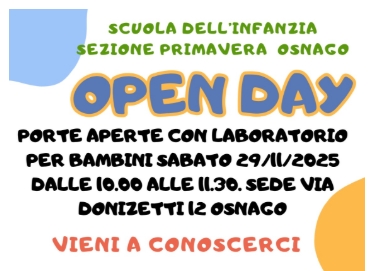 Sabato 29 novembre, dalle 10 alle 11.30, in via Donizetti 12 a Osnago si terrà l’Open Day della scuola
